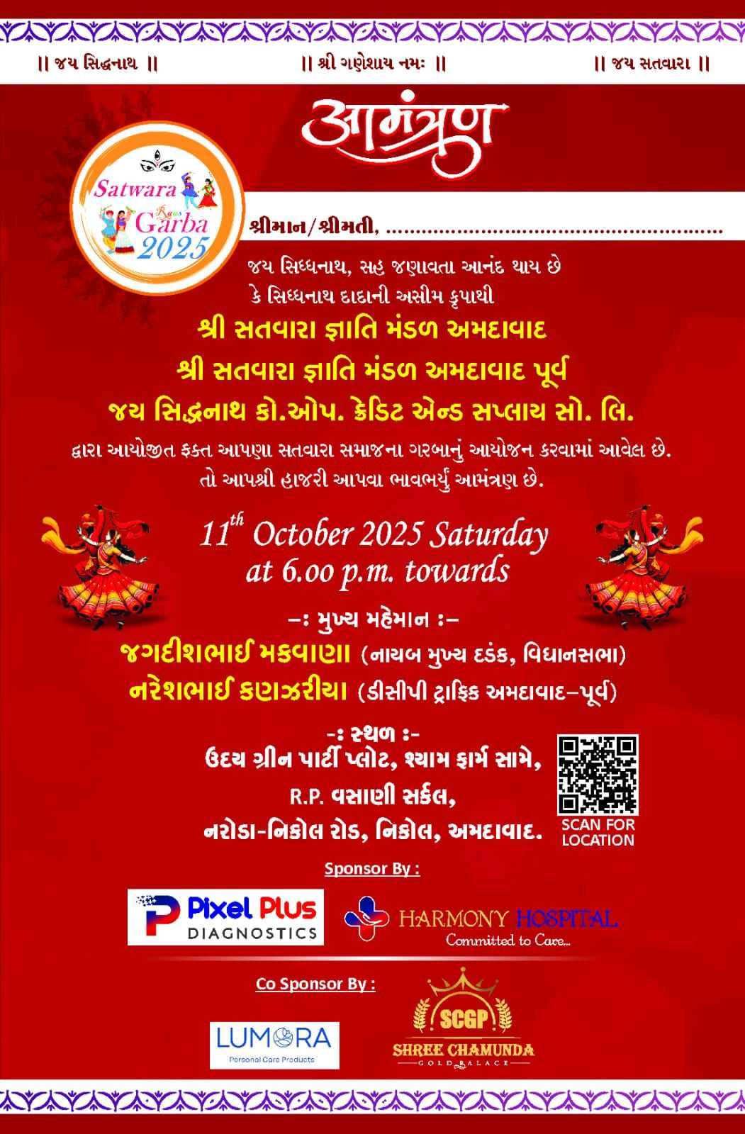 જય સિધ્ધનાથ સહ જણાવતા આનંદ થાય છે કે સિધ્ધનાથ દાદાની અસીમ કૃપાથી શ્રી સતવારા જ્ઞાતિ મંડળ અમદાવાદ અને જય સિદ્ધનાથ કો.ઓપ. ક્રેડિટ એન્ડ સપ્લાય સો. લિ. દ્વારા ૧૧ ઓક્ટોબર ૨૦૨૫ શનિવાર સાંજે ૬.૦૦ વાગ્યે ફક્ત આપણા સતવારા સમાજના ગરબાનું આયોજન કરવામાં આવેલ છે. તો આપશ્રી હાજરી આપવા ભાવભર્યું આમંત્રણ છે. મુખ્ય મહેમાન જગદીશભાઈ મકવાણા (નાયબ મુખ્ય દડંક, વિધાનસભા) નરેશભાઈ કણઝરીયા (ડીસીપી ટ્રાફિક અમદાવાદ-પૂર્વ) સ્થળ ઉદય ગ્રીન પાર્ટી પ્લોટ, શ્યામ ફાર્મ સામે, R.P. વસાણી સર્કલ, નરોડા-નિકોલ રોડ, નિકોલ, અમદાવાદ જાહેરાત માટે બેનર Size : ૬ x ૩ નાં ₹ ૨,૧૦૦ ગરબા ના એન્ટ્રી પાસ ની કિંમત ૧૦૦ રૂપિયા રાખેલ છે. સંપર્ક ચંદ્રેશભાઈ કડિયા - ૯૪૨૬૦ ૭૯૪૦૧ પંકજભાઈ પરમાર - ૯૯૯૮૪ ૪૯૬૮૮ જયેશભાઈ રાઠોડ - ૯૯૭૯૯ ૫૮૨૮૫ જાગૃતિબેન સી. કડિયા - ૯૪૦૯૪ ૦૭૯૯૪ હીનાબેન આર. ચાવડા - ૮૨૦૦૩ ૨૫૫૦૬ નીતાબેન જે. રાઠોડ - ૯૪૨૬૫ ૮૪૪૭૭